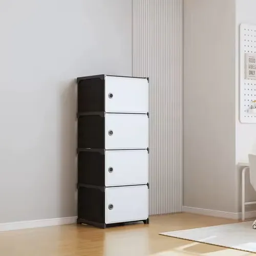 Dulap de depozitare din plastic pentru podea cu 4 niveluri, cu cadru robust si compartimente cu usite din material plastic subtire, flexibil si foarte rezistent. Ideal pentru utilizare ca suport pentru pantofi, ca mobilier de intrare sau pentru organizarea spatiului de depozitare.